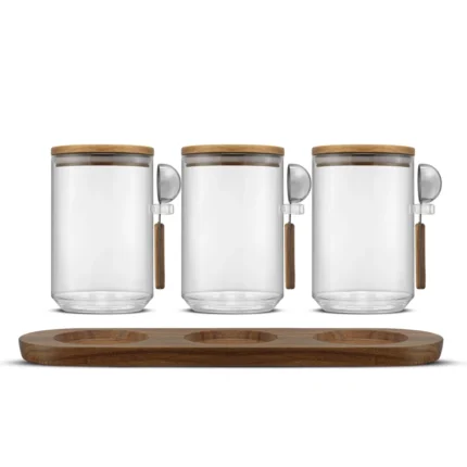 Glass Canisters Trio with Wood Lids and Tray
